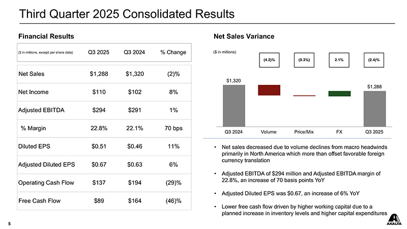 Axalta Coating Systems Ltd. (NYSE: AXTA) reported net sales of $1.3 billion for the quarter ended Sept. 30, down 2% year-over-year, as the company achieved record adjusted earnings despite persistent headwinds in its automotive refinish business.