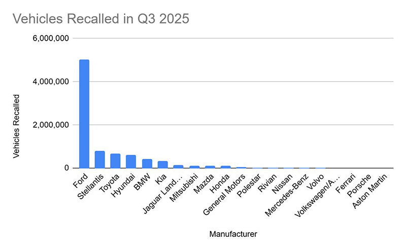 Ford accounted for nearly 60 percent of third-quarter recalls, with 5,041,241 vehicles affected. Stellantis ranked second with 774,612 vehicles recalled, followed by Toyota with 656,395 vehicles.