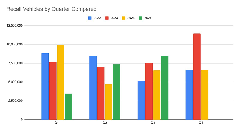 Vehicle manufacturers issued 96 recall campaigns covering nearly 8.5 million vehicles in the U.S. in the third quarter, marking the highest quarterly total since the first quarter of 2024, according to a report by BizzyCar the service recall management platform provider for dealerships.