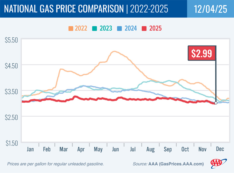 The average price stood at $2.99 as of Wednesday, down from $3.03 a week ago. The last time the national average reached $3 or below was May 2021.