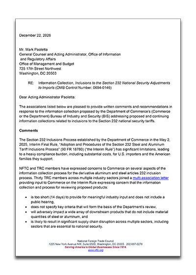 The letter, led by the National Foreign Trade Council, was addressed to Mark Paoletta, general counsel and acting administrator of the Office of Information and Regulatory Affairs.