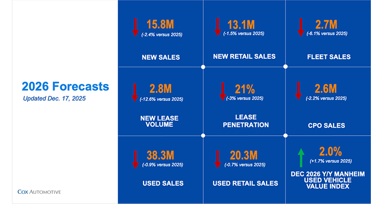 Cox Automotive forecasts U.S. new-vehicle sales will reach 15.8 million units in 2026, a 2.4% decline from 2025 levels, according to the company’s annual industry outlook released Monday.