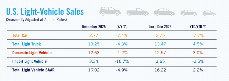 • New Light-Vehicle Sales Rose 2.4% to 16.2 Million Units in 2025 January 13, 2026