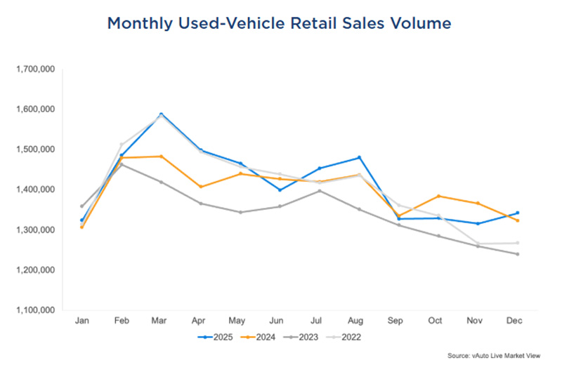 Retail used-vehicle sales totaled 1.34 million units in December, up 3% from the same month a year earlier and 2% higher than November, according to Cox Automotive data.