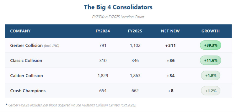The one major exception according to the report was the Boyd Group’s acquisition of Joe Hudson’s Collision Centers, which combined the second- and fifth-largest U.S. operators by store count into a 1,301-location platform and reduced the industry’s top consolidator tier from five