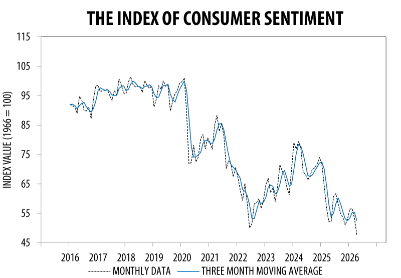 The Index of Consumer Sentiment fell to 47.6 in the preliminary April release, down 10.7% from 53.3 in March and 8.8% below the April 2025 reading of 52.2. The Index of Consumer Expectations dropped 10.8% to 46.1, while the Current Economic Conditions Index declined 10.2% to 50.1,