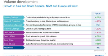 AkzoNobel N.V. (AMS: AKZA; OTCMKTS: AKZOY) reported first-quarter 2026 adjusted earnings before interest, taxes, depreciation and amortization (EBITDA) of €345 million ($404.2 million) on April 22, a 3% decline as reported but a 7% increase at comparable scope and constant currencies, as the coatings supplier delivered its fourth consecutive quarter of year-over-year margin expansion. Adjusted […]